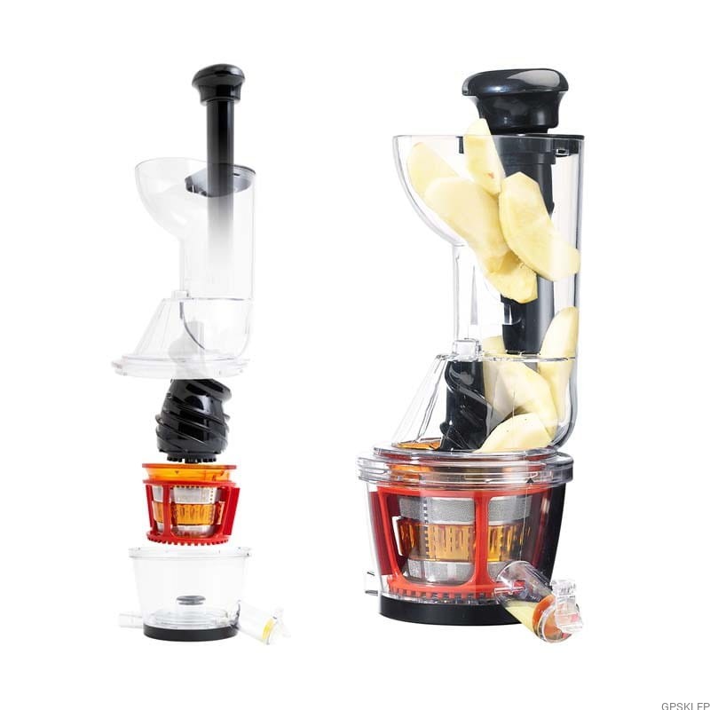 - W zestawie akcesoria do produktu: popychacz ABS, szczoteczka do czyszczenia, pojemniki na sok i miąższ o pojemności 1L