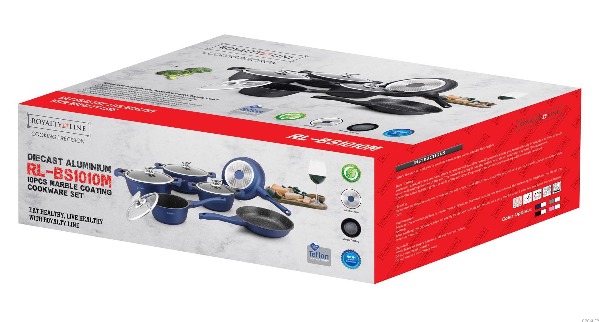 Zestaw garnków wysokiej jakości RL-BS1010 w kolorze burgund, to wyjątkowo interesująca propozycja marki Royalty Line - zestaw garnków z powłoką marmurową, oraz nieprzywierającą powłoką greblonową. Jest to jedna z najlepszej jakości powłok nieprzywierających, gdyż jest wytrzymała, a przede wszystkim nie zawiera żadnych szkodliwych substancji typu kadm czy PFOA. Odmiana greblonu 3+ oznacza również, że można swobodnie używać tych garnków i patelni bez tłuszczu, a potrawy nie przyklejają się do dna.