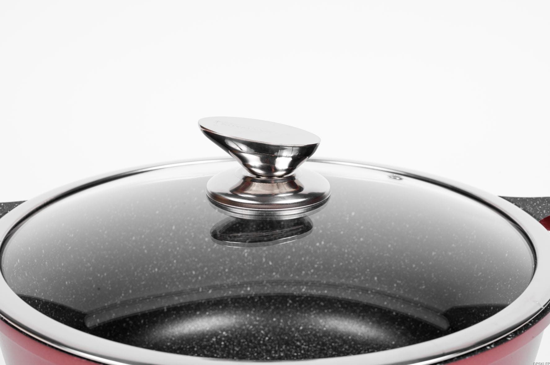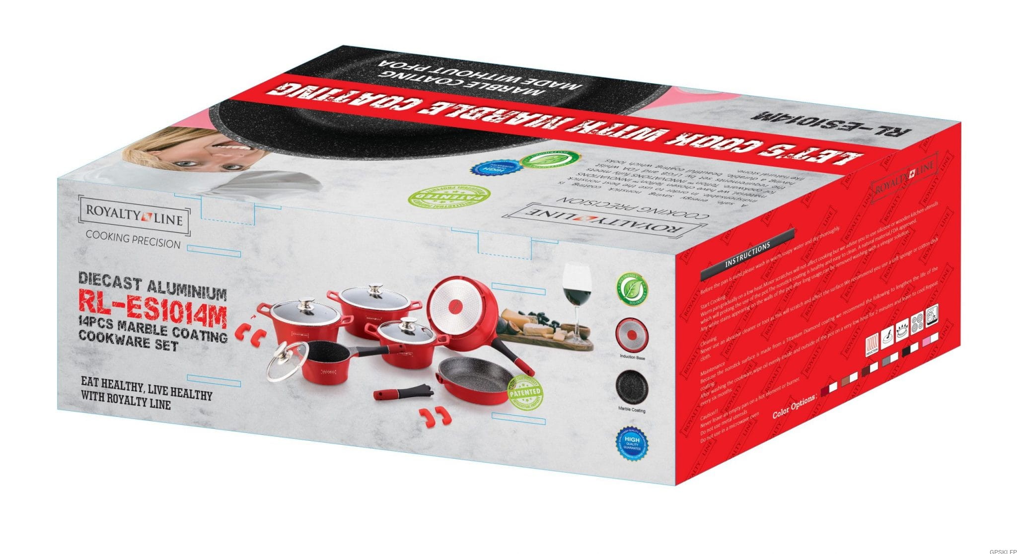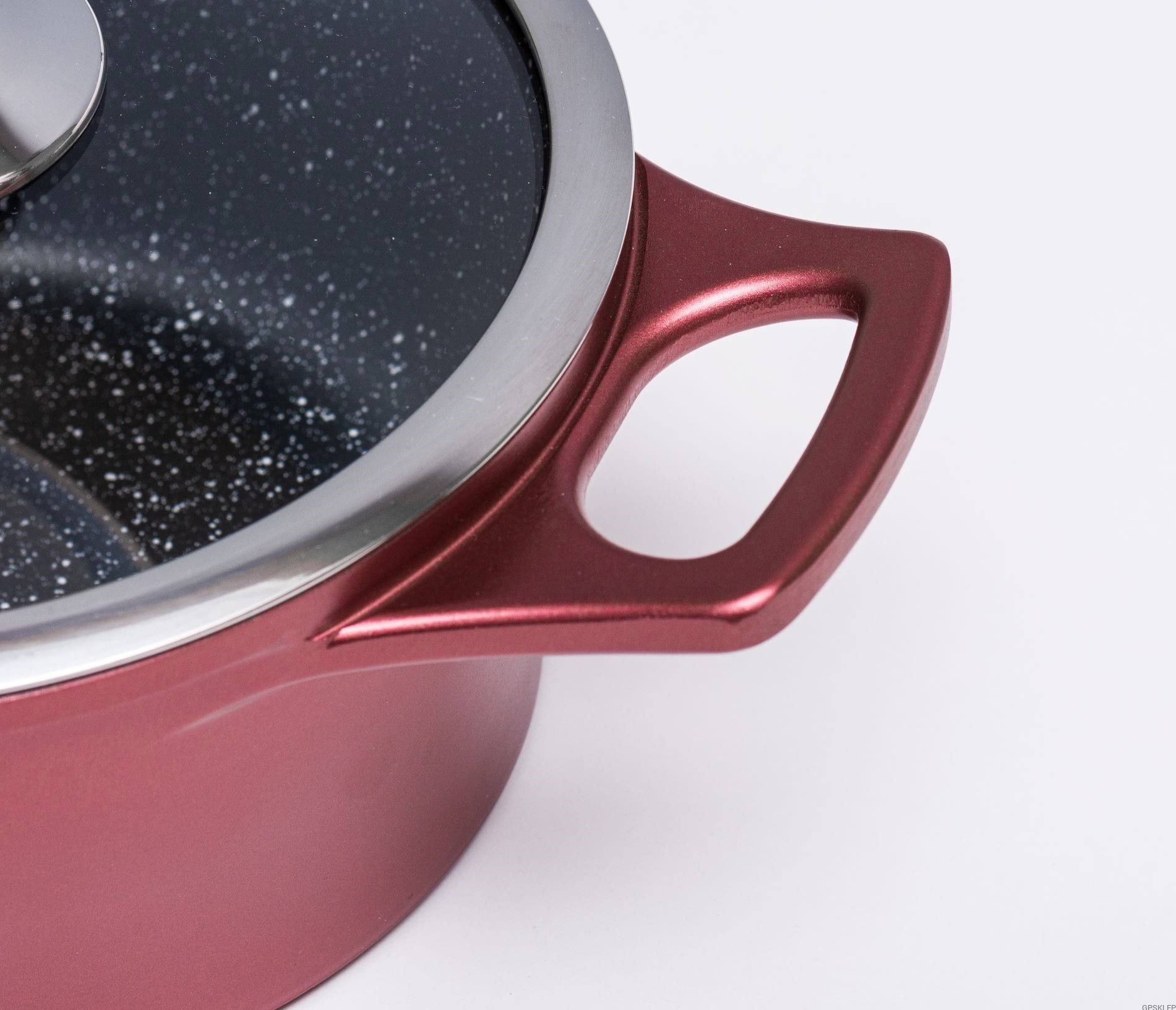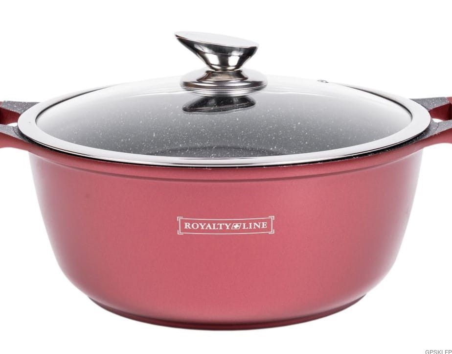 Zestaw garnków wysokiej jakości RL-ES1014M w kolorze burgund, to propozycja firmy Royalty Line - zestaw garnków z powłoką marmurową, oraz nieprzywierającą powłoką greblonową. Jest to jedna z najlepszej jakości powłok nieprzywierających, gdyż jest wytrzymała, a przede wszystkim nie zawiera żadnych szkodliwych substancji typu kadm czy PFOA. Odmiana greblonu 3+ oznacza również, że można swobodnie używać tych garnków i patelni bez tłuszczu, a potrawy nie przyklejają się do dna.