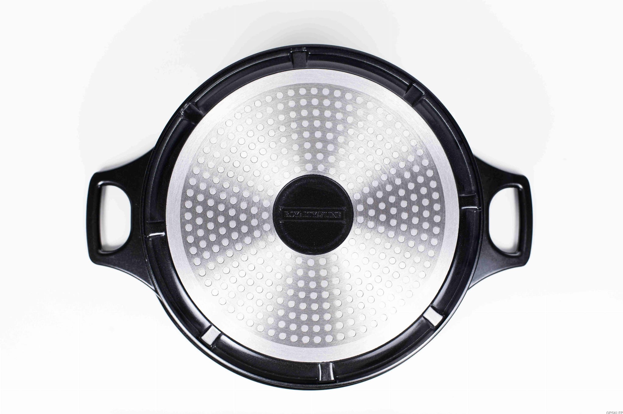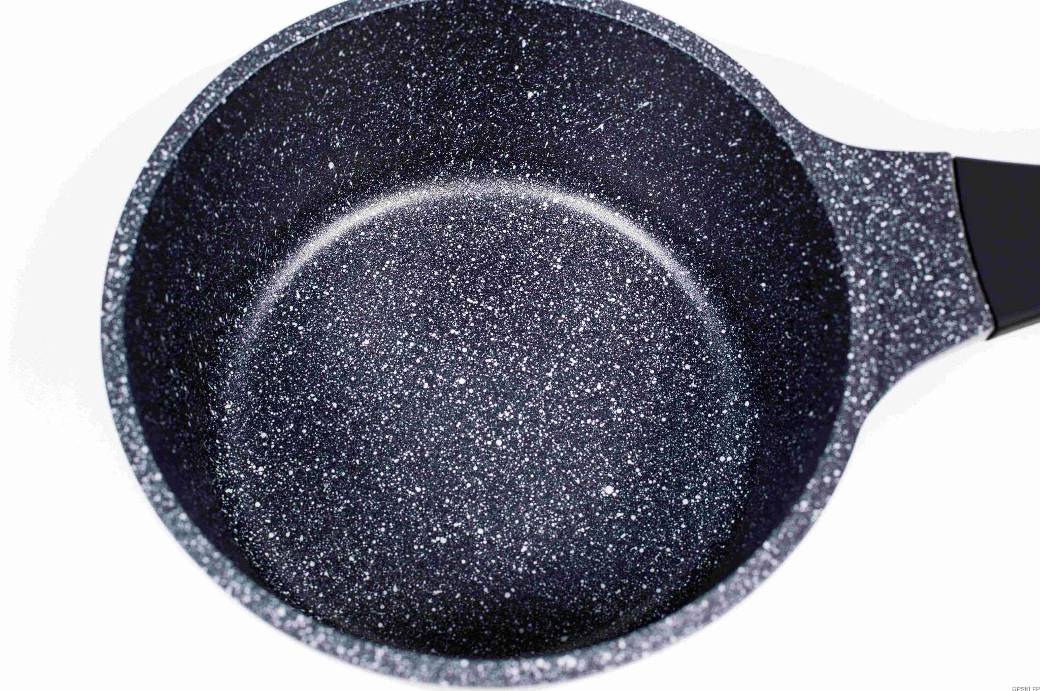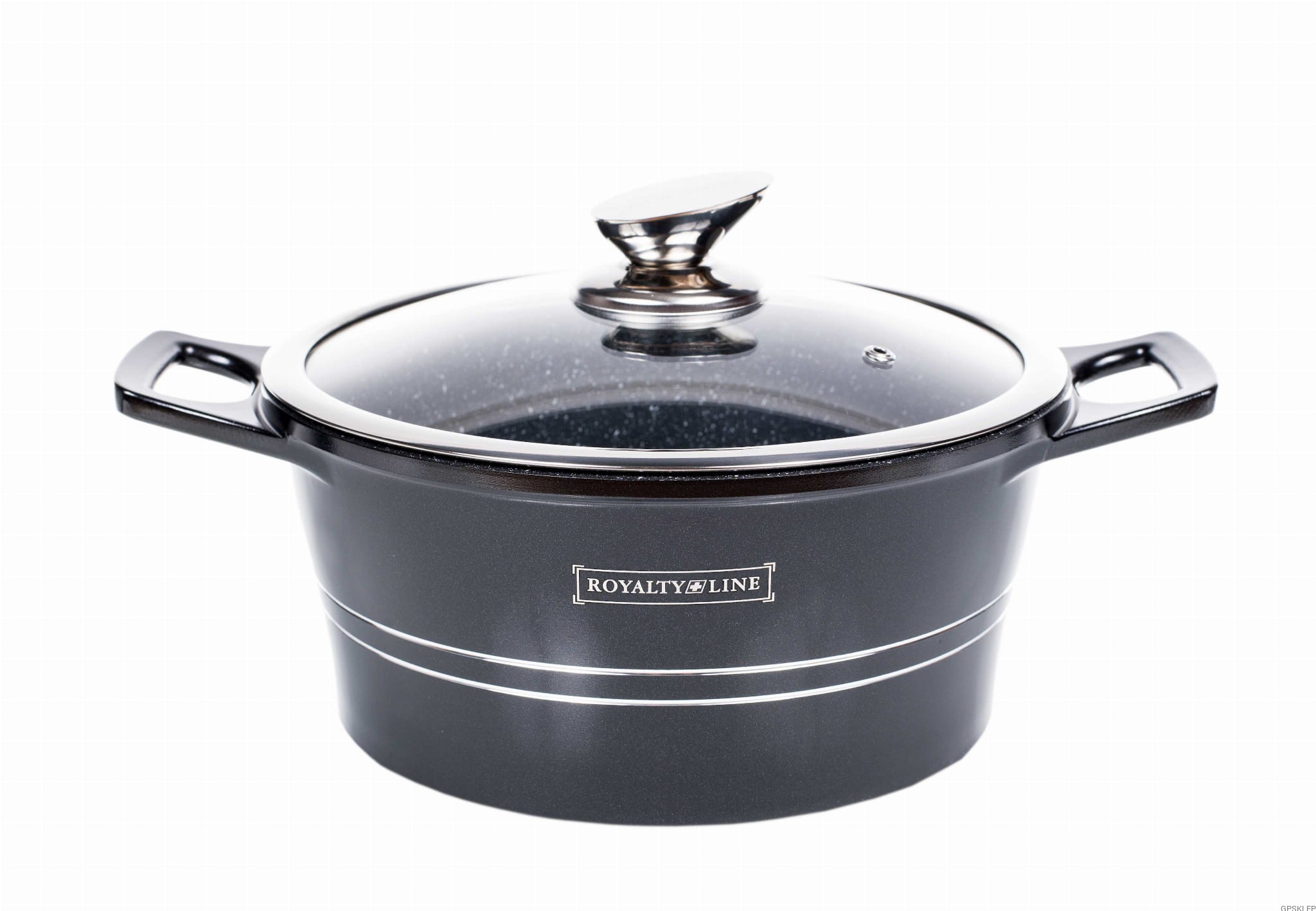 Zestaw garnków wysokiej jakości RL-ES2014M w kolorze czarnym, to elegancka i praktyczna propozycja firmy Royalty Line - zestaw garnków z powłoką marmurową, oraz nieprzywierającą powłoką greblonową. Powłoka greblonowa to jedna z najlepszej jakości powłok nieprzywierających, gdyż jest wytrzymała, a przede wszystkim nie zawiera żadnych szkodliwych substancji typu kadm czy PFOA. Odmiana greblonu 3+ oznacza również, że można swobodnie używać tych garnków i patelni bez tłuszczu, a potrawy nie przyklejają się do dna. Garnki takie doskonale nadają się do smażenia i duszenia warzyw, mięsa, do robienia sosów, gotowania zup i innych przygotowań.