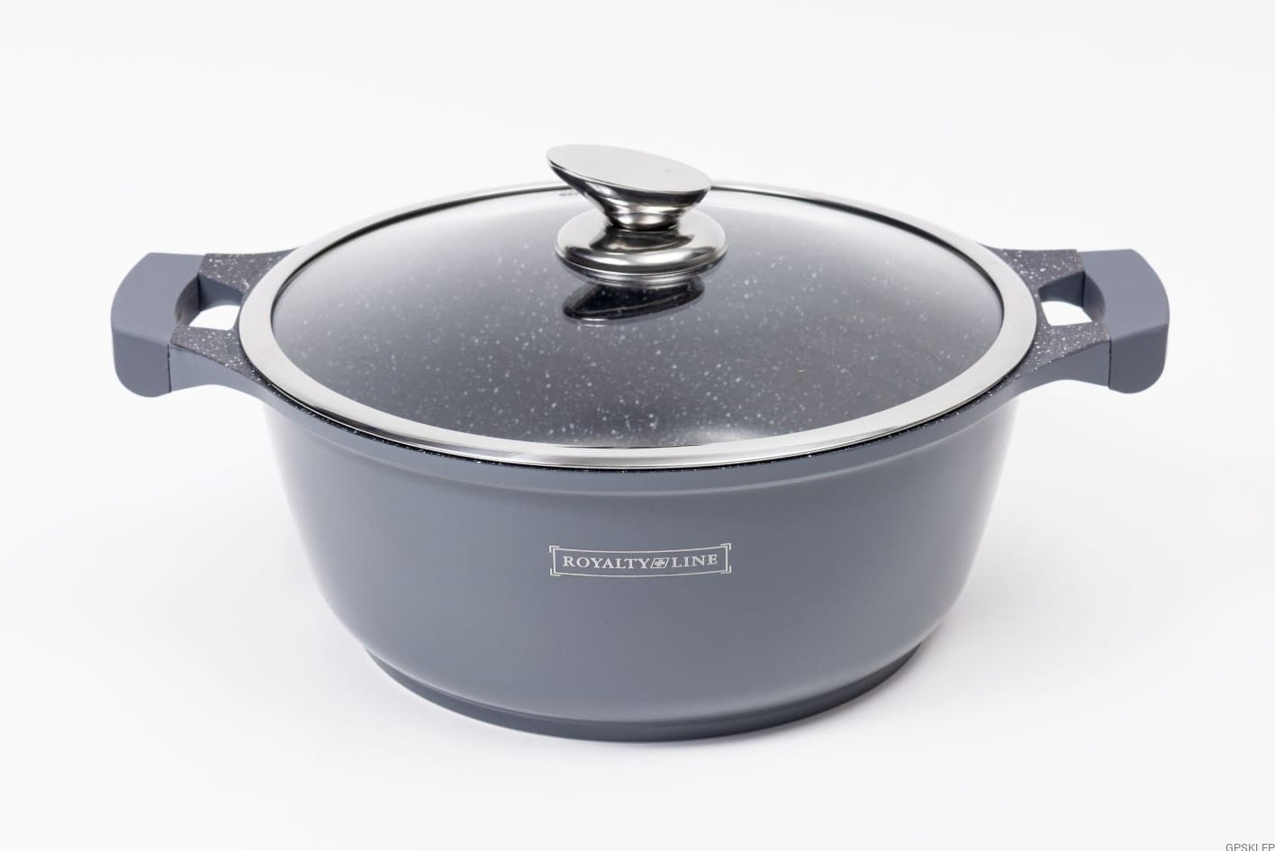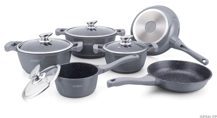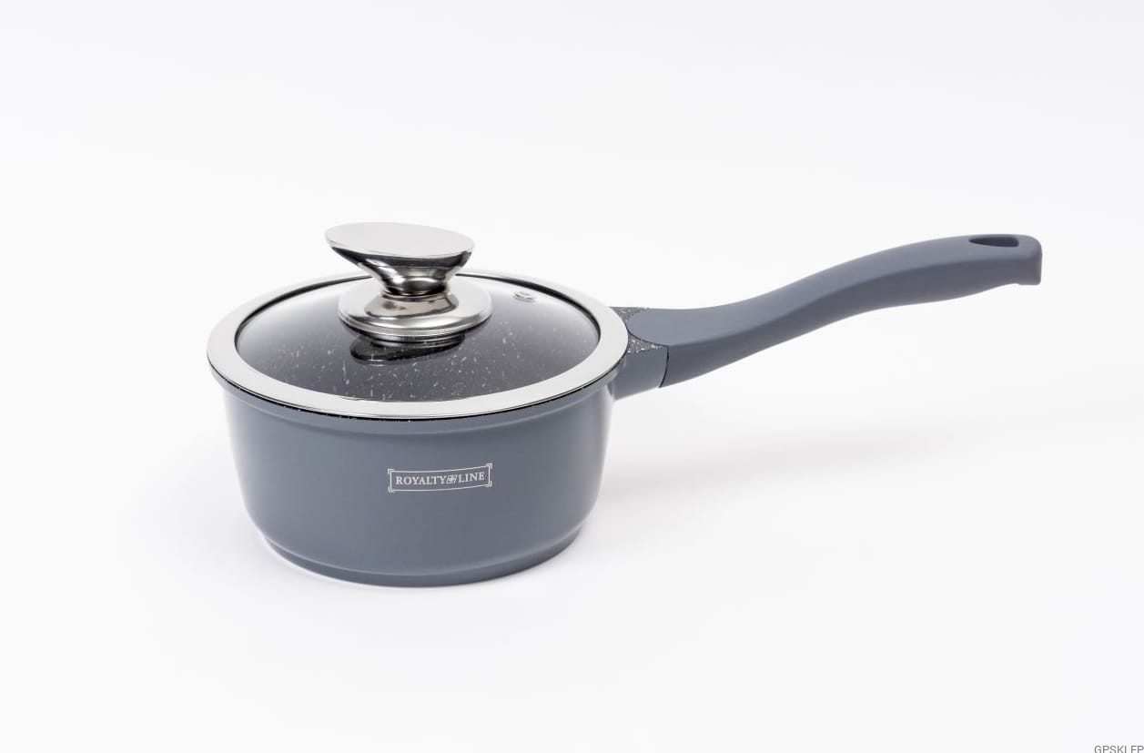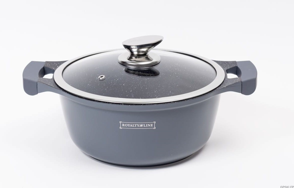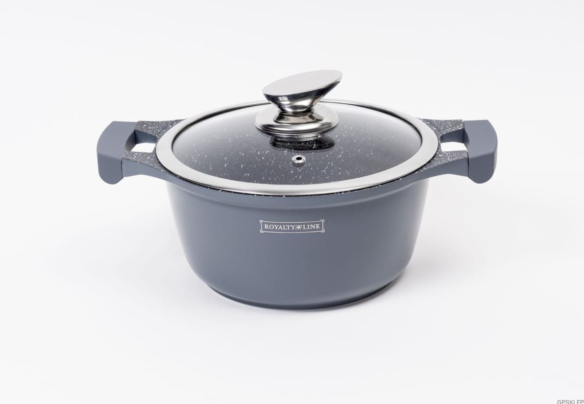 Zestaw garnków wysokiej jakości RL-BS1010 w kolorze szarym, to wyjątkowo interesująca propozycja marki Royalty Line - zestaw garnków z powłoką marmurową, oraz nieprzywierającą powłoką greblonową. Jest to jedna z najlepszej jakości powłok nieprzywierających, gdyż jest wytrzymała, a przede wszystkim nie zawiera żadnych szkodliwych substancji typu kadm czy PFOA. Odmiana greblonu 3+ oznacza również, że można swobodnie używać tych garnków i patelni bez tłuszczu, a potrawy nie przyklejają się do dna.