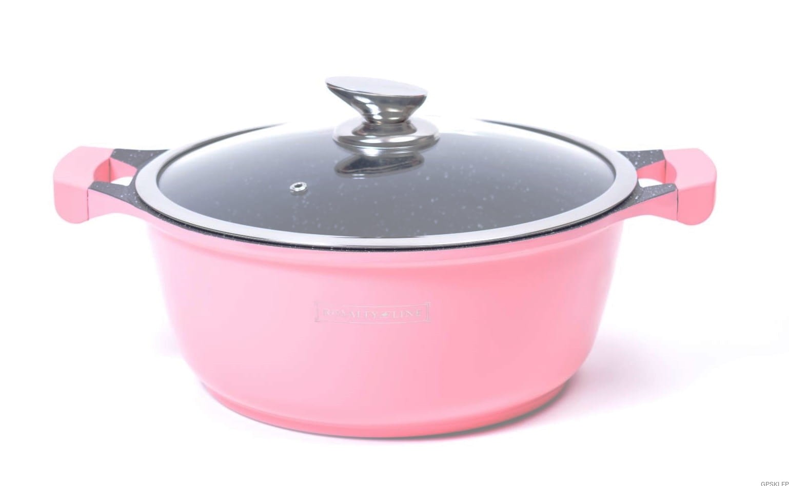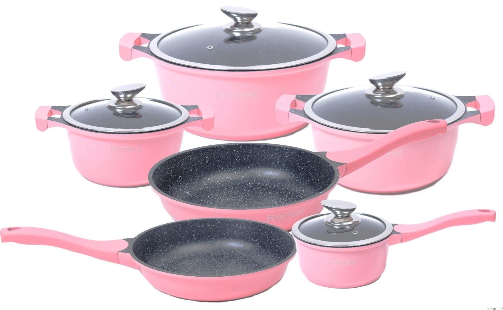 Zestaw garnków wysokiej jakości RL-BS1010 w kolorze różowym, to wyjątkowo interesująca propozycja marki Royalty Line - zestaw garnków z powłoką marmurową, oraz nieprzywierającą powłoką greblonową. Jest to jedna z najlepszej jakości powłok nieprzywierających, gdyż jest wytrzymała, a przede wszystkim nie zawiera żadnych szkodliwych substancji typu kadm czy PFOA. Odmiana greblonu 3+ oznacza również, że można swobodnie używać tych garnków i patelni bez tłuszczu, a potrawy nie przyklejają się do dna.